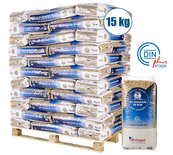 Pellets certifiés DIN Plus et PEFC, composés de résineux et feuillus. Pouvoir calorifique élevé, faible taux d’humidité, cendres et poussières.